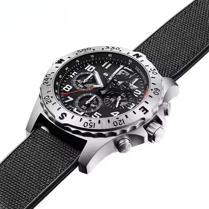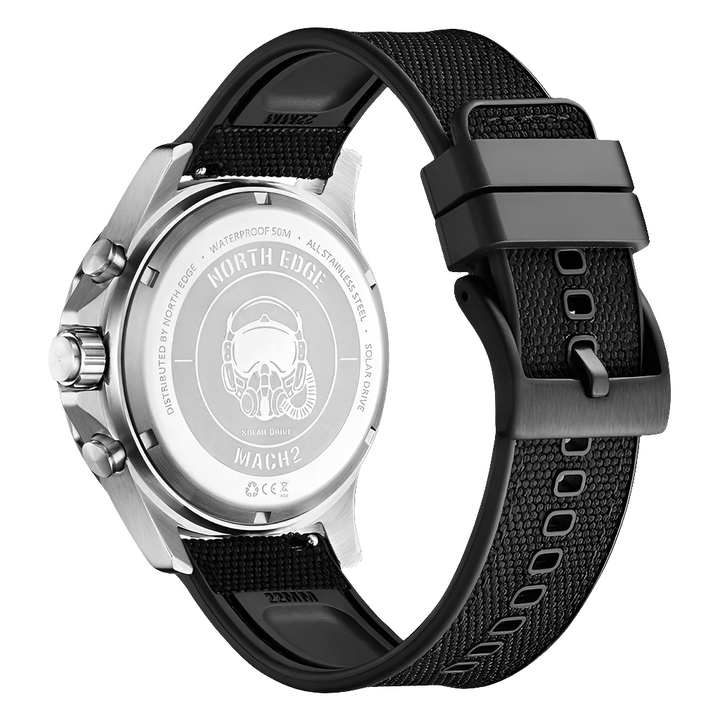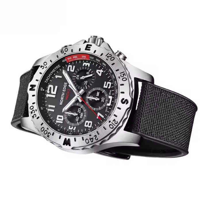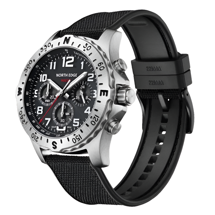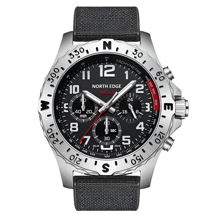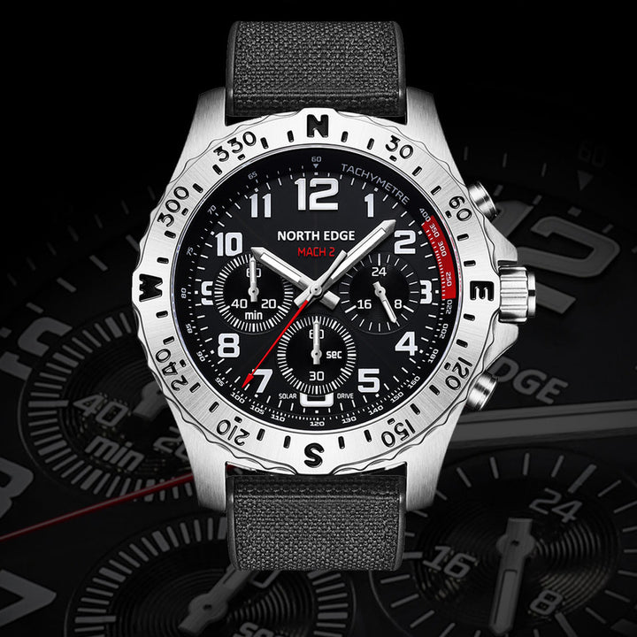 Montre homme Étanche 50M Acier Inoxydable Chronographe Élégant Plongez dans l'aventure avec la montre NORTH EDGE MACH 2, votre partenaire infatigable au poignet. Grâce à son énergie solaire, dites adieu aux piles et profitez d'une endurance sans fin. Son boîtier en acier inoxydable 316L et son étanchéité de 50M en font une alliée robuste pour toutes vos escapades. Avec son chronographe triple et son verre minéral trempé, elle allie précision et durabilité, tout en affichant un style audacieux.